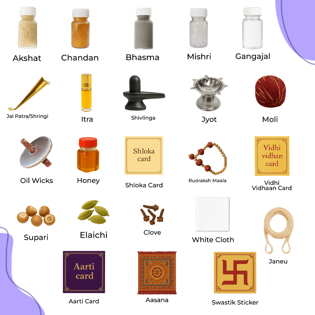 It includes all the pure and traditional samagri required for Rudra  Abhishek—such as Shringi/Jal Patra, Gangajal, Rudraksha Mala, and dhoop—along with a guide to help you perform the ritual correctly.